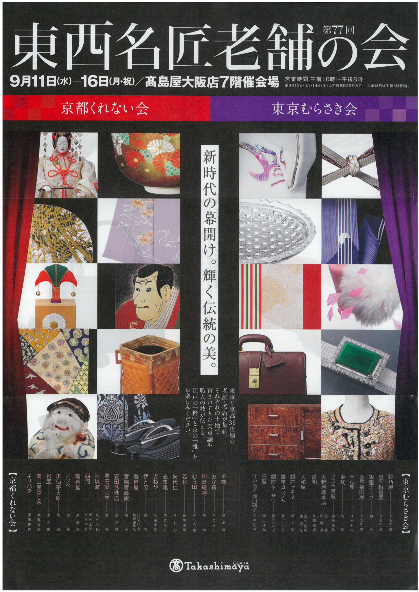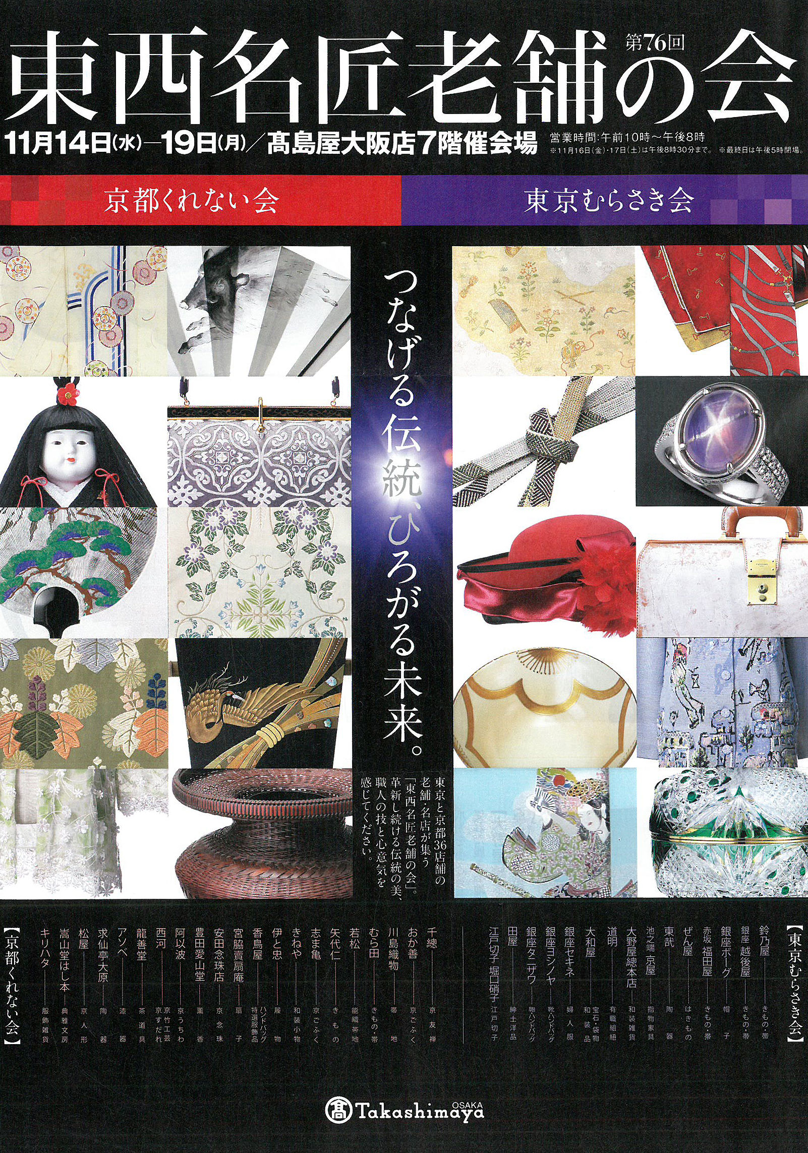 11月14日より6日間、髙島屋大坂店 7階催会場にて「第76回東西名匠老舗の会」が開催します。